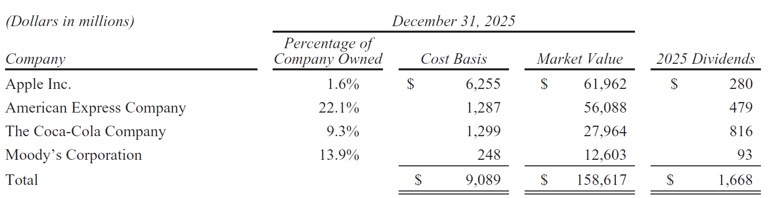 Nu Buffett is afgetreden, zal Greg Abel verantwoordelijk zijn voor de beleggingsportefeuille. Het is opvallend dat er zo weinig aandacht werd besteed aan portfolio manager Ted Weschler en dat hij slechts 6% van de totale beleggingsportefeuille beheert. Misschien is het feit dat Combs en Weschler nooit echt een groter deel van de portefeuille in beheer kregen wel indicatief voor hun prestaties. Wellicht heeft Abel, in lijn met zijn meer hands-on aanpak, Todd en Ted wel aangesproken op hun staat van dienst. Het feit dat de portfolio managers niet een groter deel van de liquide aandelenportefeuille onder beheer hebben gekregen resulteerde er in ieder geval al in dat Todd Combs zijn heil elders zocht bij JP Morgan eind 2025.