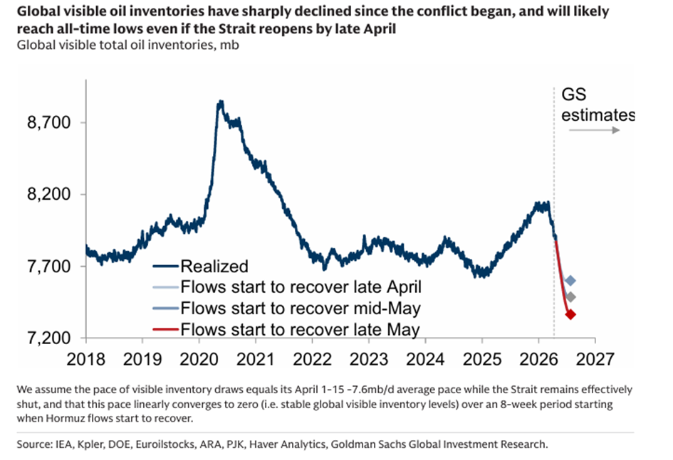 Per saldo betekent dit een verlies van meer dan 13 miljoen vaten olie-export per dag, bovenop een forse verstoring van LNG-stromen. Prijzen voor Brent olie stegen van USD 65 naar een piek van USD 139 per vat op 7 april, en stabiliseerde daarna rond de USD 100.