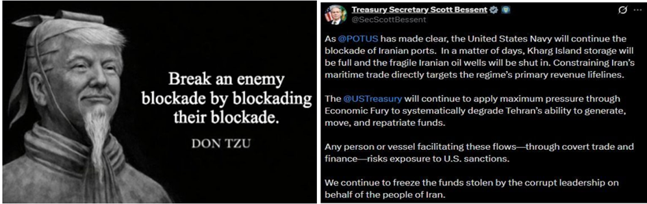 - Langdurige blokkade van de Golf, treft zowel de Golfstaten maar ook Iran hard. Het is een rationele zet van Trump om een blokkade met een blokkade te treffen en daarbij zowel Iran en China te treffen. Iran heeft weinig financiële middelen om militairen te betalen en loopt risico dat olievelden gesloten worden en daarmee beschadigd raken voor toekomstige productie. Daarnaast zullen China en India de druk op Iran opvoeren om schepen vrije doorgang te verlenen, aangezien beide landen sterk afhankelijk zijn van de import van energie.