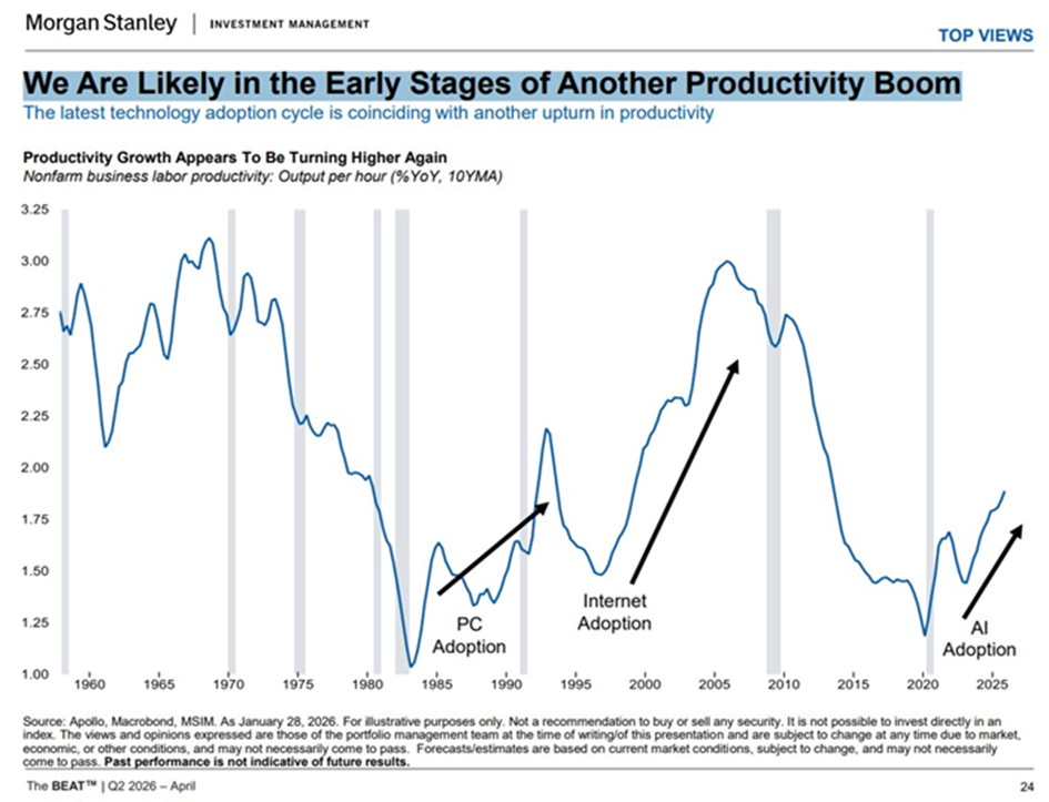 Morgan Stanley ziet AI in het artikel “AI Market Trends 2026: Global Investment, Risks, and Opportunities" niet langer als een technologiethema, maar als een bredere macro-economische kracht. In de visie van de bank verschuift AI van een verhaal over chips, software en datacenters naar een thema dat doorwerkt in productiviteit, winstgroei, energieverbruik, kredietmarkten en geopolitieke concurrentie. Daarmee wordt AI een van de verklaringen waarom markten in 2026 niet eenvoudig in een klassiek risk-on of risk-off regime passen.