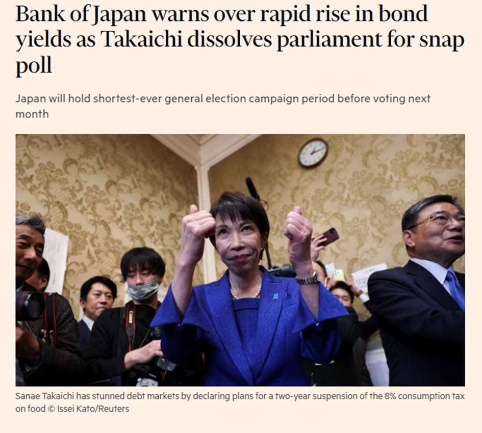 De risicopremie kan verder stijgen doordat de overheidstekorten opnieuw oplopen. Premier Sanae Takaichi voert een assertiever internationaal beleid, met elementen die doen denken aan een Japanse “chips act” voor de industrie. Tegelijk lopen de spanningen met China op, wat kan leiden tot hogere defensie-uitgaven. En vanzelfsprekend betekent een hogere rente ook een groter beslag van rentelasten op de begroting. Premier Takaichi ontbond deze week onverwacht het parlement en schreef een vervroegde verkiezing uit voor 8 februari. In haar campagne zit onder meer het voorstel om de 8% consumptiebelasting op voedsel twee jaar te schorsen (orde van grootte ~¥5 biljoen), wat bij beleggers zorgen oproept over extra uitgaven en fiscale discipline.
