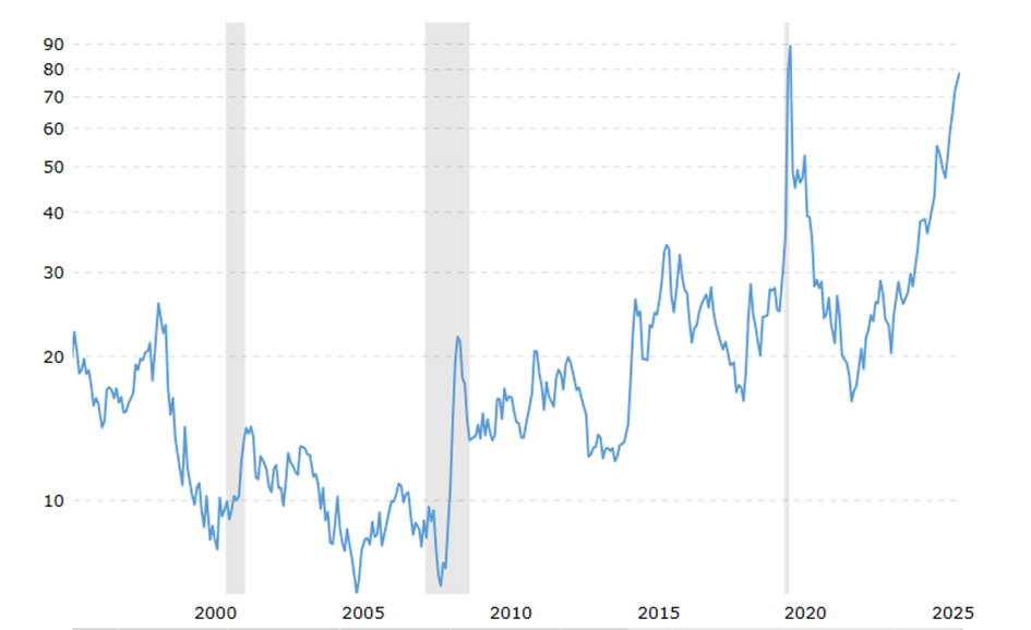 Dit speelt al in het bijzonder bij koper, dat een belangrijke rol inneemt in de energietransitie. zeer ruwe berekeningen concluderen dat voor de productie van 1 ton koper meer dan 4000 -7000 liter diesel wordt verbruikt (met grote variaties afhankelijk van erts, mijnbouwmethode en procesroute). Voor goud ligt dit onvoorstelbaar vele ordes hoger: dezelfde berekeningen leiden tot extreme schattingen tot wel 7000-18000 liter diesel consumptie voor de productie van 1 kilogram goud. In de onderstaande grafiek is te zien dat de ratio goudprijs–olie historisch gezien soms extreme niveaus bereikt. De vorige piek deed zich voor toen olie tijdens de coronaperiode kortstondig negatief handelde. De huidige, opnieuw zeer hoge ratio wijst erop dat de marges van goudmijnbouwers verder kunnen versnellen.