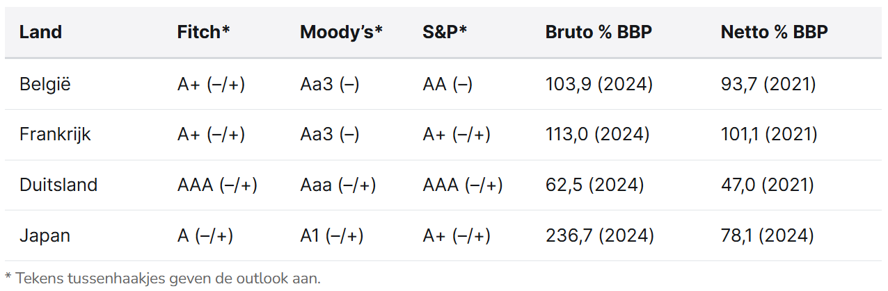 De bruto staatsschuld van België bedraagt ongeveer 104% van het bbp in 2024. Een officiële berekening van de netto staatsschuld ontbreekt, op een schatting uit 2021 na, wat het moeilijk maakt om de werkelijke schuldpositie genuanceerd te beoordelen. Tegelijkertijd blijven de begrotingstekorten hardnekkig hoog: zowel in 2025 als 2026 wordt een tekort van circa 5,5% van het bbp verwacht. Het is dan ook niet verrassend dat de regering-De Wever onder toenemende druk van de kapitaalmarkten komt te staan om structurele hervormingen door te voeren.