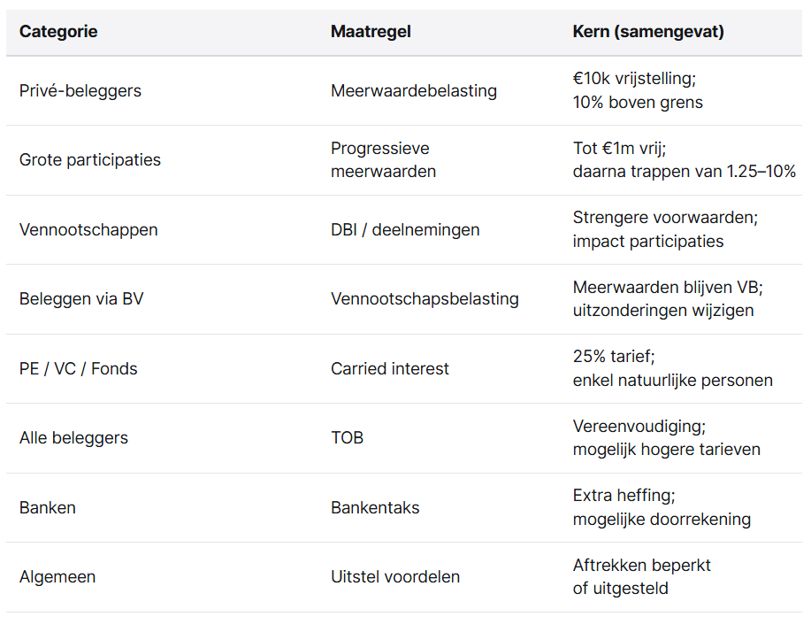 Tabel – Nieuwe belastingen en fiscale maatregelen voor beleggers (privé & zakelijk)