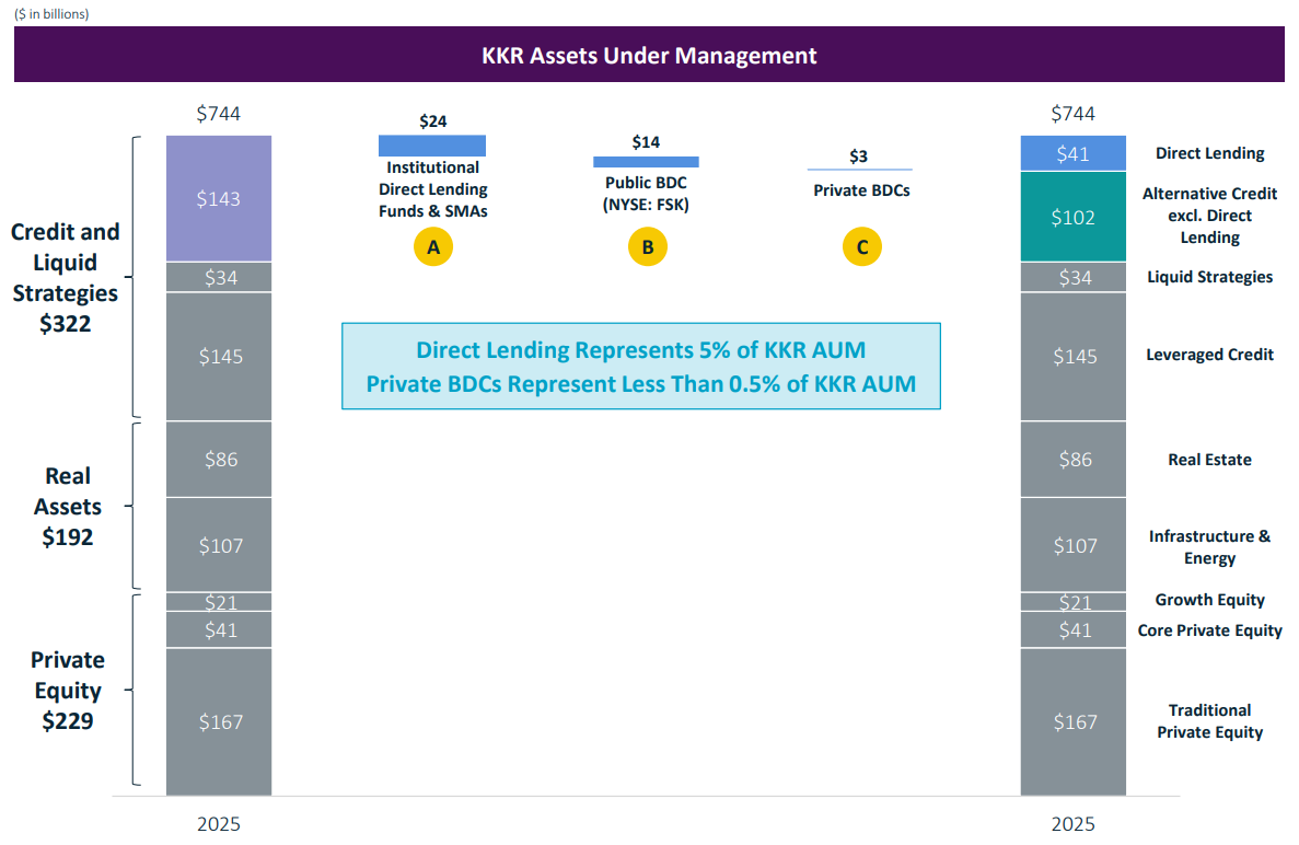 At KKR (New York: KKR), the situation is more nuanced. Compared to Brookfield, they are slightly more exposed to the current market pressure and have not chosen to the same extent to immediately replenish the full outflow with their own capital. Although this makes KKR more sensitive to market sentiment on paper, it is essential to put this into the right perspective. Relative to their total assets under management (AUM), the exposure remains very manageable. As the chart shows, Direct Lending—the segment currently receiving the most media attention — accounts for approximately 5% of total AUM. The BDCs, which are at the center of the discussion regarding drawdown limits, account for less than 3% of total capital.