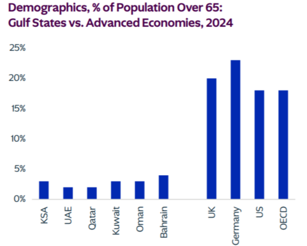 The young population of the Gulf States is a powerful driver of domestic growth. With an average age of under 30 and a rapidly growing middle class, demand for education, healthcare, fintech, e-commerce and housing is increasing. The strong digital adoption, supported by 5G networks, artificial intelligence and data centers, also opens up new investment opportunities in technological infrastructure, cloud capacity and consumer services.