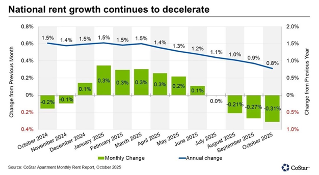 In addition to the recently fallen oil prices, US rents are now also beginning to fall month-on-month. According to CoStar, one of the largest real estate data providers in the US via Apartments.com, the rental market in October showed the sharpest decline in more than fifteen years: a month-on-month decrease of -0.3% and only 0.8% growth year-on-year. Due to a combination of much new construction, weakening demand, and large regional differences, rents are under further pressure. Although these are "asking rents", historically they almost always move in line with the contract rents that are included in the official inflation measure.