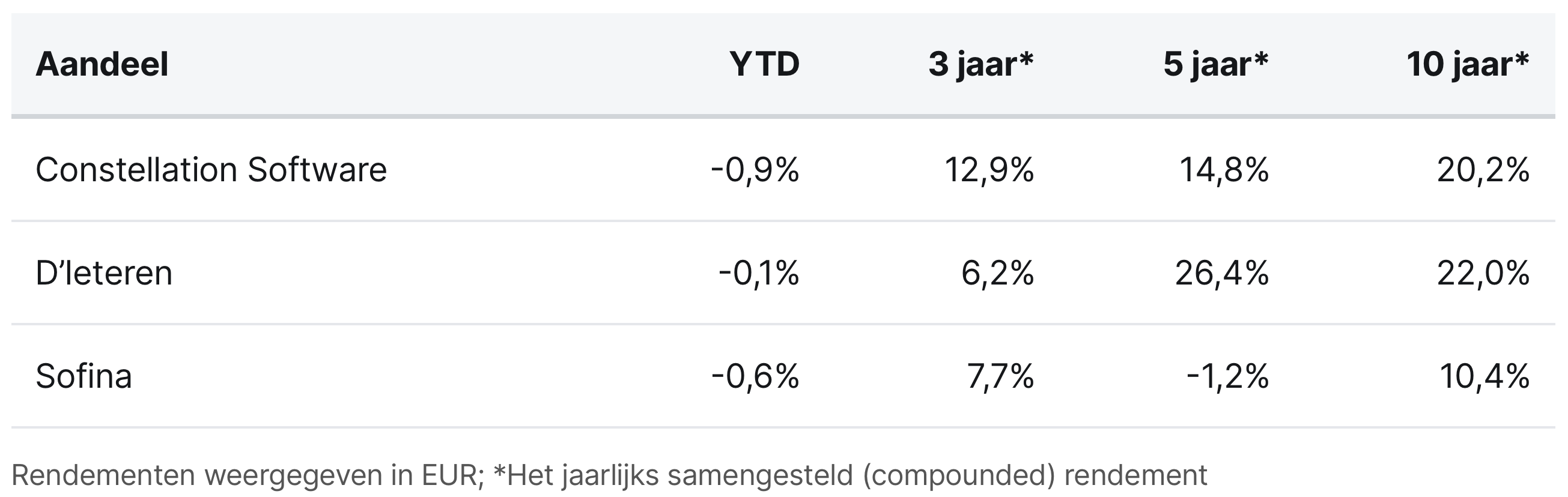 Constellation Software, D'ieteren en Sofina worden momenteel aan de beurzen van Toronto en Brussel verhandeld op koersen van respectievelijk CAD 3.260, EUR 154,80 en EUR 247,20 per aandeel.