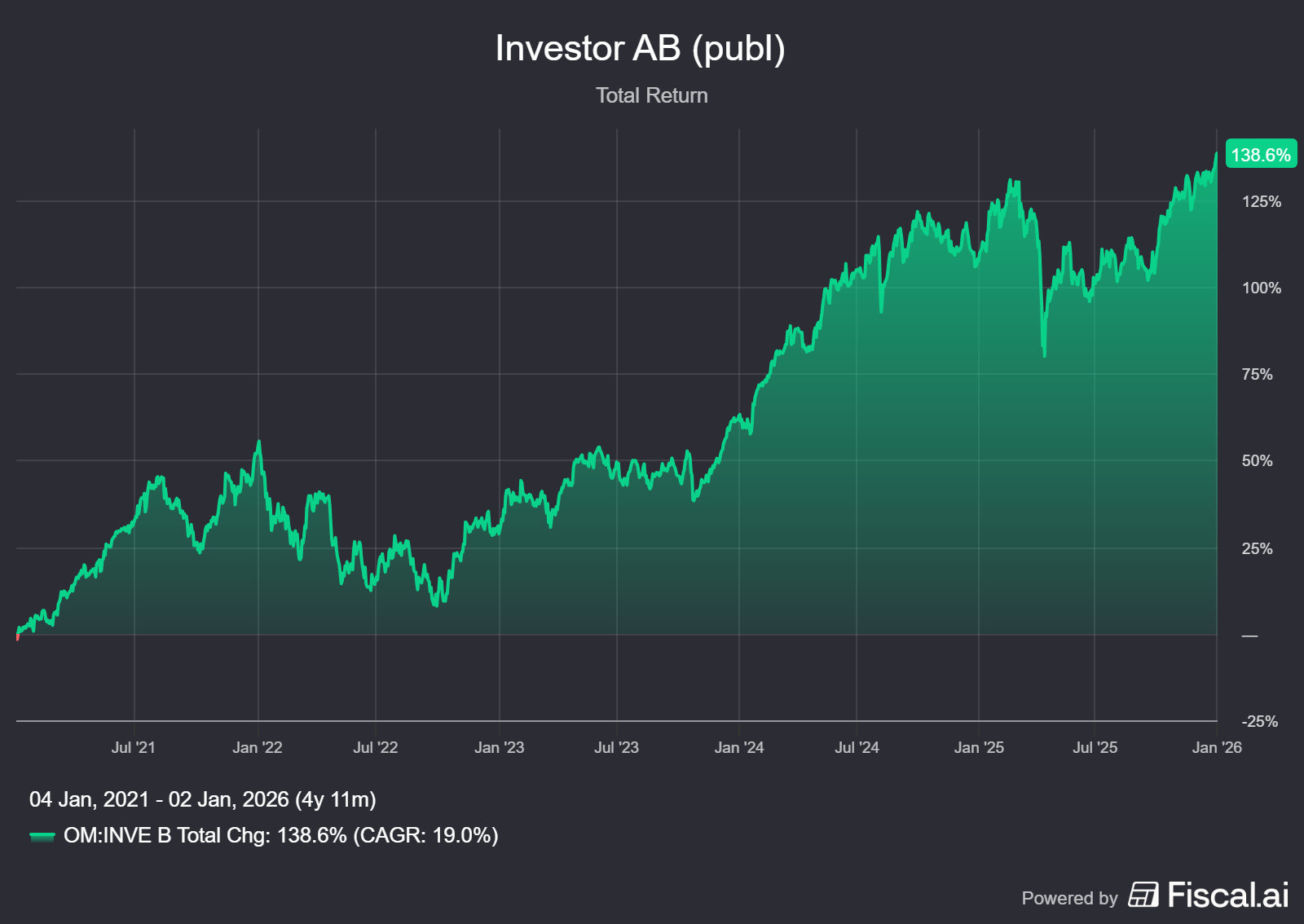 Investor AB wordt momenteel op de beurs van Stockholm verhandeld op een koers van SEK 325,50 per B-aandeel.