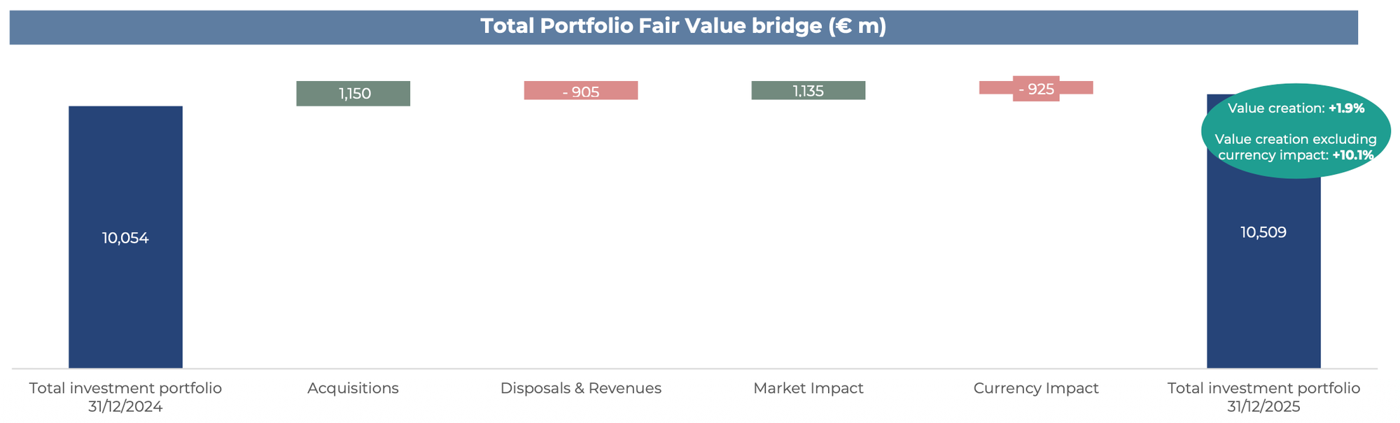 Om de evolutie van het afgelopen jaar te begrijpen, kijken we naar de onderstaande grafiek. Hierin is de 'brug' te zien van de waardeontwikkeling binnen de portefeuille.