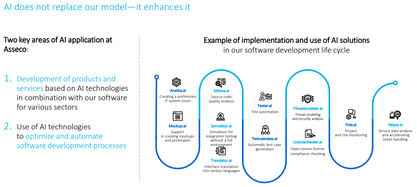 Adam Góral, oprichter en president van de raad van bestuur van Asseco, benadrukt dat de opkomst van kunstmatige intelligentie een onomkeerbare impact heeft op de sector. Hij stelt hierover: "AI beïnvloedt onze wereld absoluut, en onze bedrijven moeten daar adequaat op reageren". In zijn visie is AI echter geen vervanger voor de menselijke specialist, maar een instrument om de kwaliteit van de dienstverlening te verhogen en de efficiëntie te verbeteren. Het doel van de groep is om met exact hetzelfde team meer te bereiken door AI-oplossingen diep in het interne productieproces te integreren.