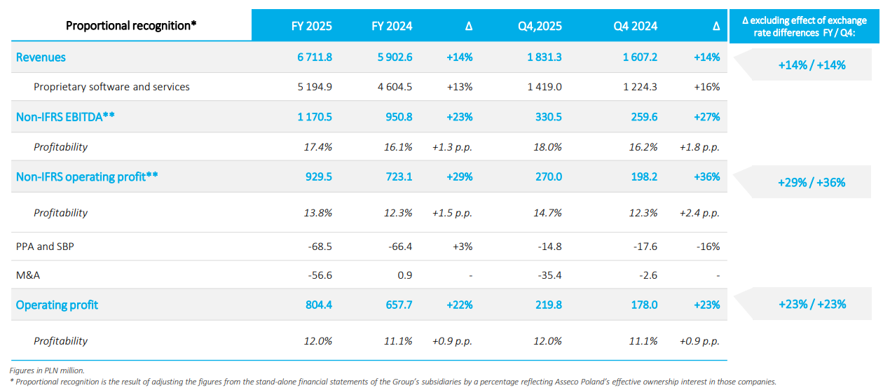 Voor beleggers in Asseco Poland zijn de geconsolideerde cijfers maar gedeeltelijk relevant. Omdat het bedrijf grote minderheidsbelangen heeft, met name via Formula Systems, geven de geconsolideerde resultaten een vertekend beeld. Wie de werkelijke waarde van Asseco wil zien, moet daarom naar de proportionele resultaten kijken. Deze laten precies zien welk deel van de winst en omzet aan de aandeelhouders van de holding toebehoort.
