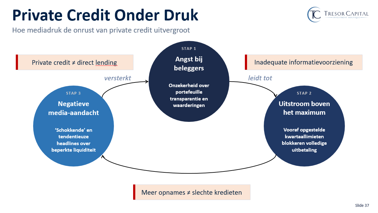 Wat we momenteel in de markt zien, is een proces waarbij angst zichzelf voedt. Zoals de bijgevoegde afbeelding illustreert, ontstaat er een schadelijke dynamiek: de onzekerheid over waarderingen dwingt beleggers massaal naar de uitgang, waardoor de maximale uitstroomlimieten direct worden geraakt. Zodra die 'deur' dichtgaat, springen de media er bovenop met sensationele headlines. In deze berichtgeving worden begrippen als private credit en direct lending vaak onterecht op één hoop gegooid. De negatieve toon suggereert bovendien dat een toename in opnames synoniem staat aan slechte kredieten, wat de paniek onder beleggers alleen maar verder aanwakkert. Zo ontstaat er een vicieuze cirkel waarin inadequate informatievoorziening en mediadruk de markten onnodig dieper in het rood duwen.