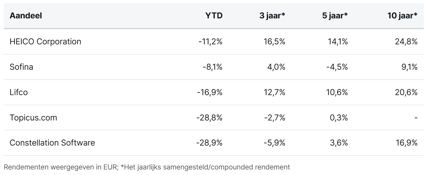 Heico, Sofina, Lifco, Topicus en Constellation Software worden aan de beurzen van New York, Brussel, Stockholm en Toronto verhandeld op koersen van respectievelijk USD 219,13 (A-aandeel), EUR 223,60, SEK 292, CAD 91,37 en CAD 2.284 per aandeel.