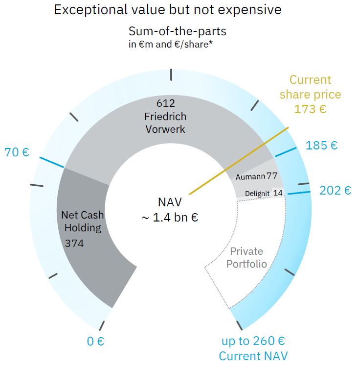 CFO Teichler rekende met bovenstaande afbeelding voor dat de intrinsieke waarde, puur gebaseerd op de beursgenoteerde belangen en de liquide middelen in de holding, alleen al neerkomt op EUR 202 per aandeel. Hierbij is de gehele private portefeuille met winstgevende bedrijven nog volledig buiten beschouwing gelaten, wat het opwaarts potentieel ten opzichte van de huidige beurskoers onderstreept.