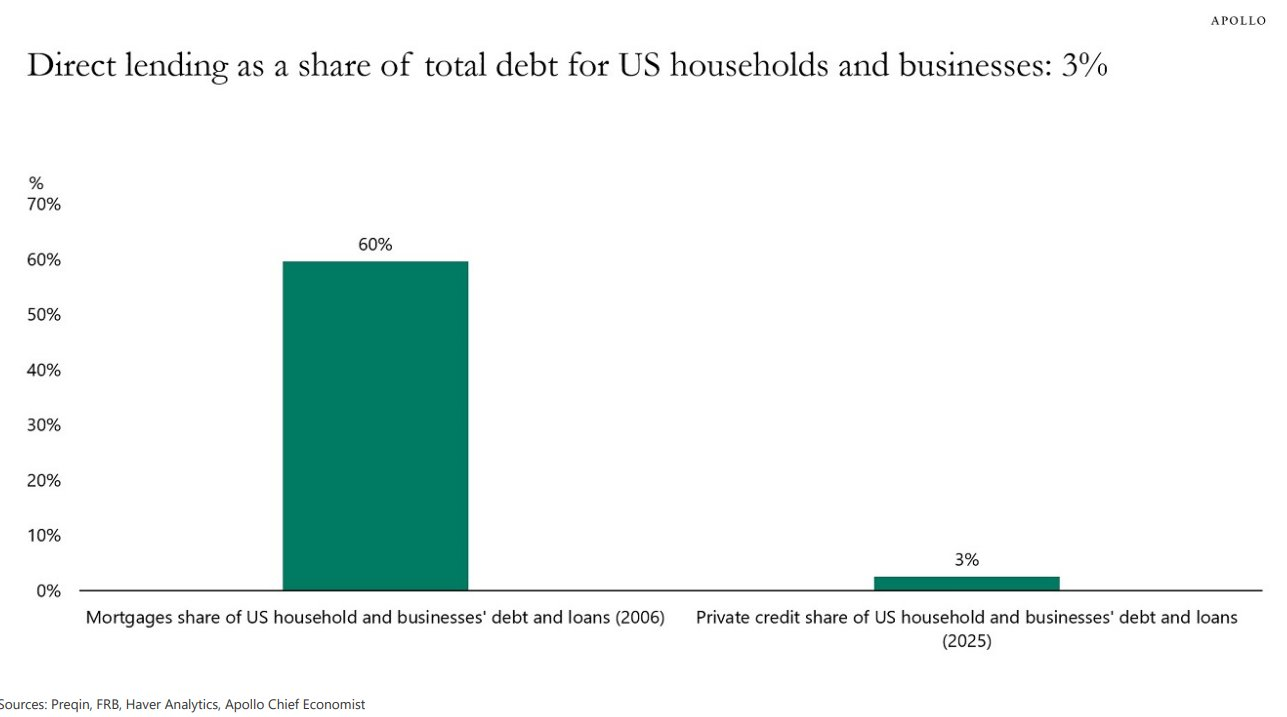 Zoals we al schreven, is de blootstelling van Brookfield en KKR door de bank genomen vrij beperkt. Er is al helemaal geen sprake van een zogenaamd systeemrisico, zoals sommigen willen doen geloven. Torsten Slok, hoofdeconoom van Apollo, deelde deze week onderstaande afbeelding. Het aandeel van private credit als percentage van de totale schulden van Amerikaanse huishoudens en bedrijven is 3%. Ter vergelijking: het aandeel van hypotheken in 2006, vlak voor de kredietcrisis ten tijde van de piek van de huizenbubbel, was 60%.