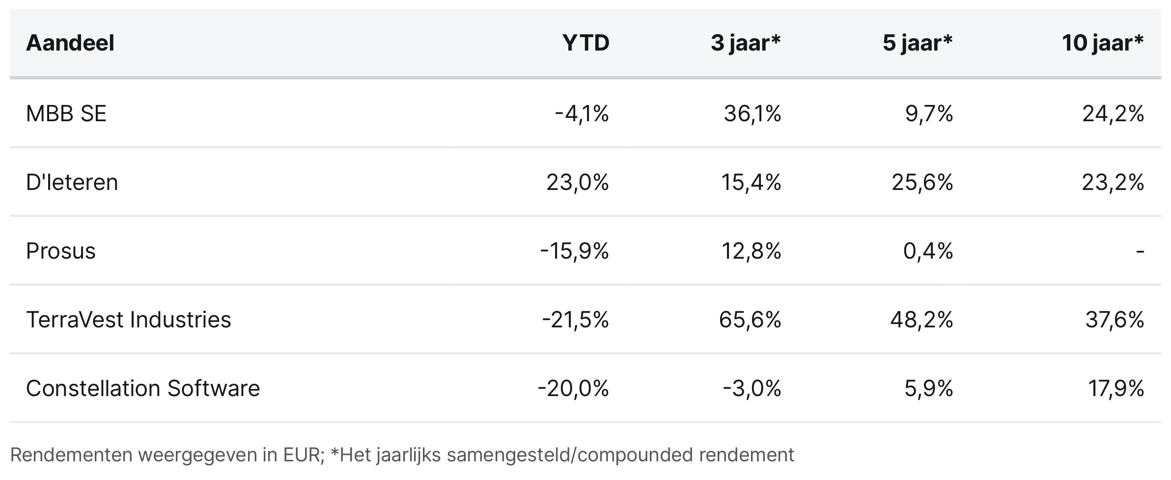 MBB SE, D'Ieteren, Prosus, TerraVest en Constellation Software worden aan de beurzen van Frankfurt, Brussel, Amsterdam en Toronto verhandeld op koersen van respectievelijk EUR 195,20, EUR 188,40, EUR 44,33, CAD 140,32 en CAD 2.662,05 per aandeel.