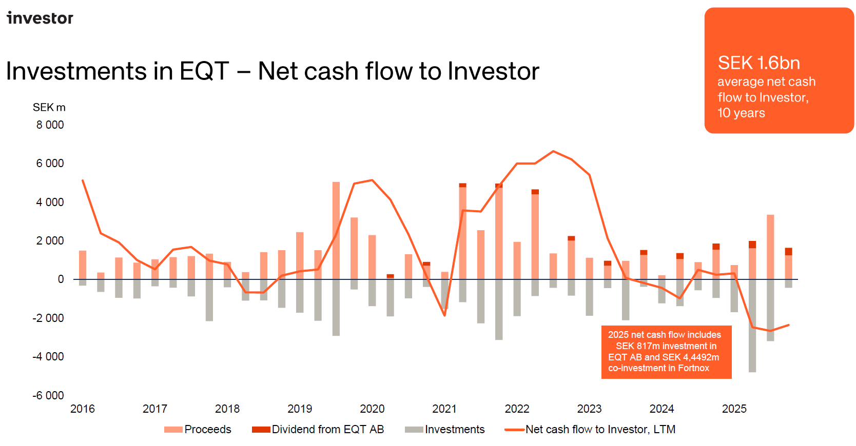 De waarde van het onderdeel EQT groeide in het vierde kwartaal met 8 procent. De beurskoers van het aandeel EQT AB liet een sterke stijging zien van 14%, terwijl de waarde van de private equity fondsen vlak bleef op 0%. Zoals gebruikelijk worden de fondsresultaten met een kwartaal vertraging gerapporteerd en betreft dit cijfer dus de prestaties in het derde kwartaal. De netto kasstroom vanuit EQT naar Investor bedroeg dit kwartaal SEK 1,2 miljard, waarbij SEK 0,9 miljard afkomstig was uit de fondsen, gedreven door gezonde exit-activiteiten.