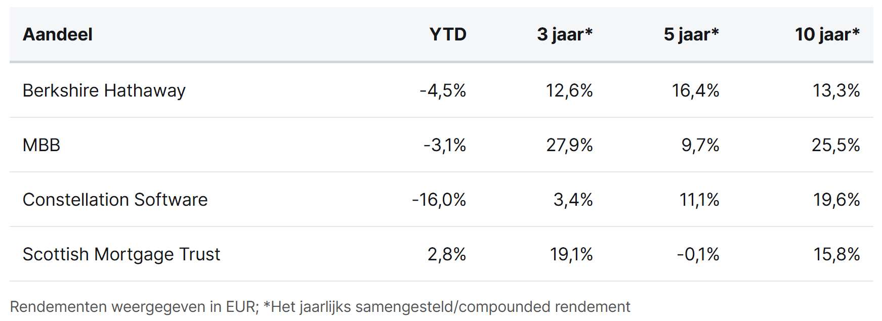 Berkshire Hathaway, MBB, Constellation Software en Scottish Mortgage Trust worden momenteel aan de beurzen van New York, Frankfurt, Toronto en Londen verhandeld op koersen van respectievelijk USD 480,28 (B-aandeel), EUR 200, CAD 2.780,81 en GBP 12,10 per aandeel.