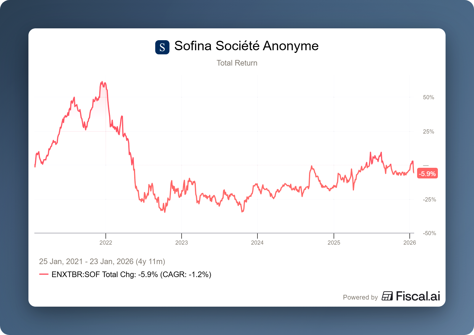 In oktober 2025 voerde Sofina een kapitaalverhoging door, waarbij nieuwe aandelen werden uitgegeven tegen een korting. Die uitgifte werkt verwaterend op de NAV per aandeel. Gecorrigeerd voor deze aandelenuitgifte zou de NAV per aandeel zijn uitgekomen op ongeveer €305. Dat impliceert een daling van circa 2% ten opzichte van de €312 per aandeel eind 2024 (en een stijging van circa 3% in de tweede jaarhelft), een beweging die volgens management grotendeels kan worden verklaard door valuta-effecten en niet door een verslechtering van de onderliggende portefeuille.