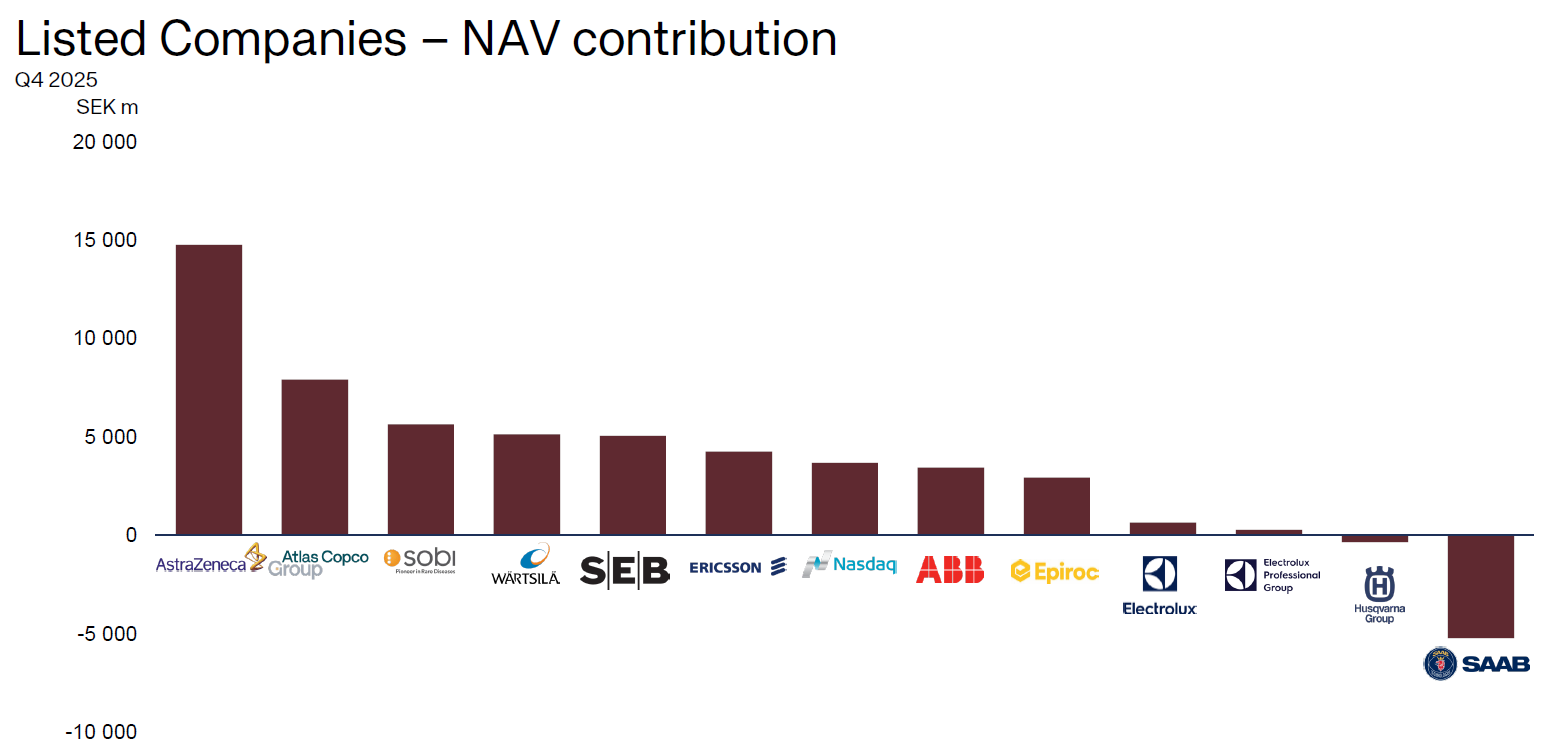 De beursgenoteerde portefeuille van Investor AB leverde in het vierde kwartaal een solide bijdrage aan de groei van de intrinsieke waarde. Het onderstaande figuur toont de bijdrage per bedrijf aan de NAV-ontwikkeling in Q4. Vrijwel alle posities droegen positief bij, met AstraZeneca, Atlas Copco, Sobi, Wärtsilä en SEB als belangrijkste waardedrijvers. Management benadrukte tijdens de conference call dat het totaalrendement van de beursgenoteerde portefeuille in het kwartaal met 6 procent grotendeels in lijn lag met de Zweedse markt, maar dat de absolute waardecreatie werd gedreven door een brede basis binnen de portefeuille.