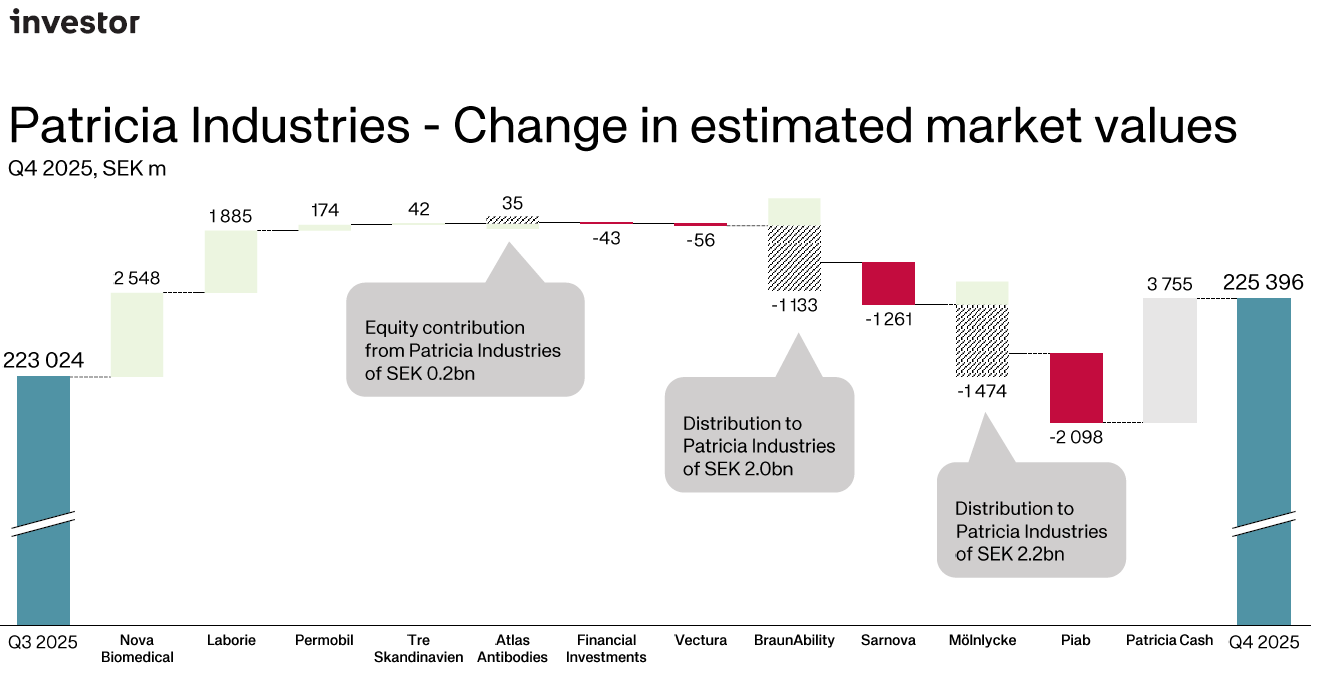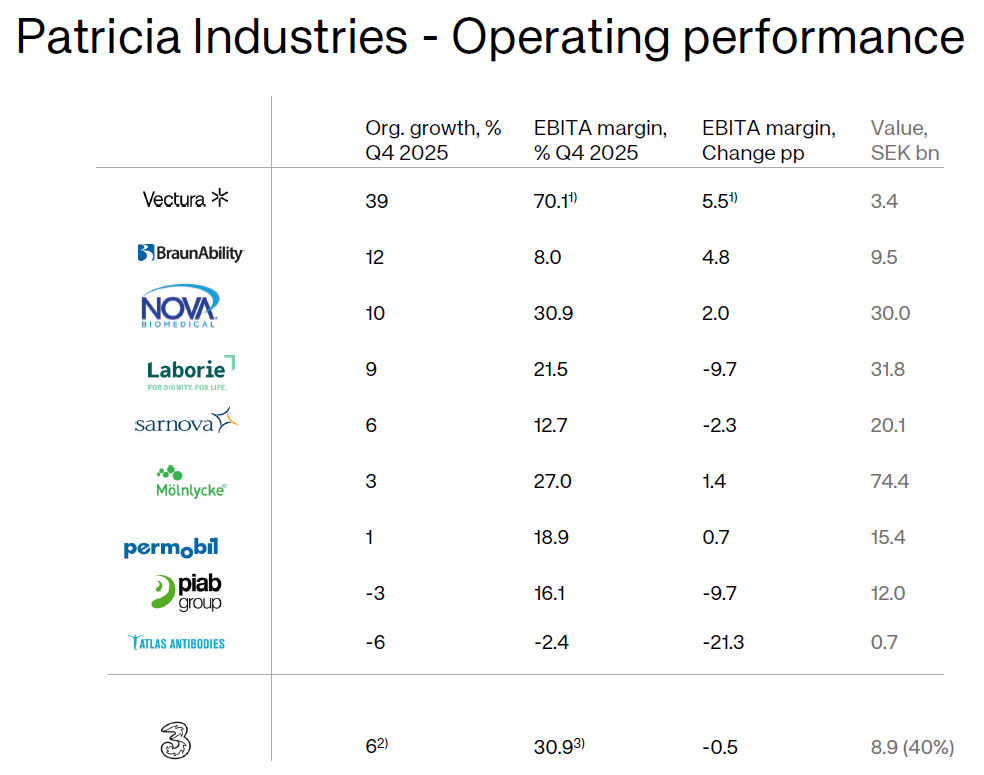 Mölnlycke is met afstand de grootste participatie binnen Patricia Industries en kreeg tijdens de conference call dan ook bovengemiddeld veel aandacht bij de analistenvragen. In Q4 rapporteerde Mölnlycke 3% organische groei, gedragen door de divisies wondverzorging (+5%) en handschoenen (+3%), terwijl de EBITDA-marge verder verbeterde tot circa 27%, ondanks aanhoudende negatieve valuta-effecten en handelstarieven.