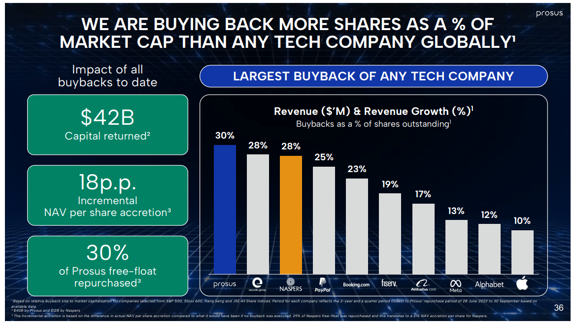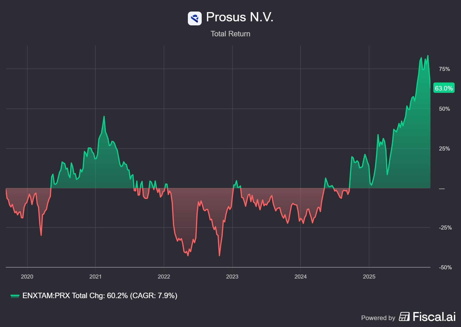 Deze verbeterde efficiëntie vergroot ook de ruimte voor kapitaalallocatie. Sinds de start van het buybackprogramma hebben Prosus en Naspers samen $42 miljard aan aandelen ingekocht, waardoor de free float met circa 30% is afgenomen. Volgens het management ligt de NAV per aandeel daardoor ongeveer 18 procentpunt hoger dan in een scenario zonder terugkoop, een uitzonderlijke prestatie, zowel absoluut als relatief.