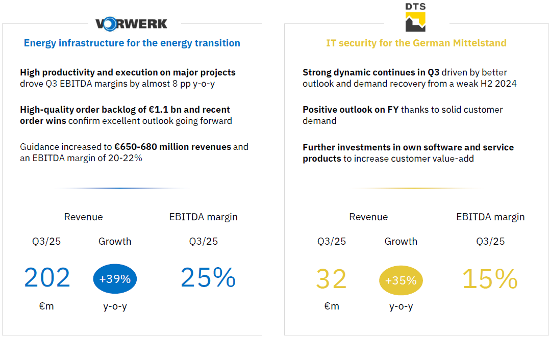 De portefeuille toont een duidelijk beeld van twee snelheden. Aan de ene kant floreert de Service & Infrastructure tak, en aan de andere kant hebben de technologische en consumententakken te maken met tegenwind. Het segment Service & Infrastructure, met Vorwerk en DTS, is de absolute groeimotor waarbij de omzet met bijna 45% steeg en de operationele winst bijna verdubbelde naar EUR 118,4 miljoen.