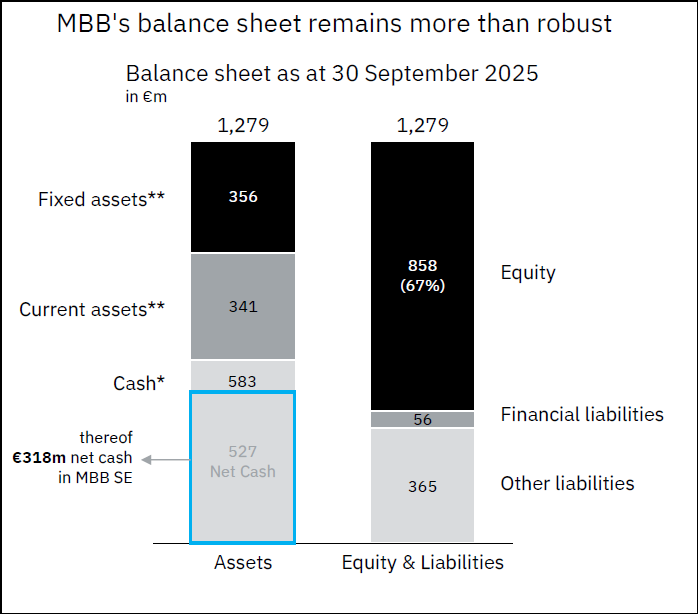 De balans van MBB is in één woord samen te vatten als solide. De holding beschikt op groepsniveau over een netto kaspositie van EUR 527 miljoen, waarvan EUR 318 miljoen direct toewijsbaar is aan de holding. Dit enorme bedrag aan liquide middelen roept de vraag op wat de volgende stap is.