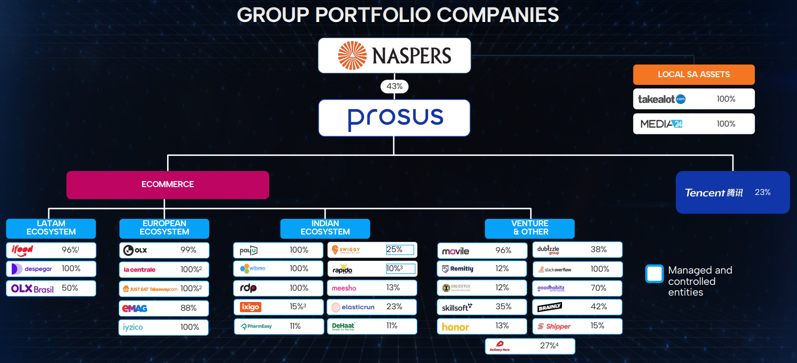 Prosus bezit en beheert inmiddels 29 ondernemingen, voornamelijk actief in Latijns-Amerika, Europa en India. Met recente acquisities zoals Rapido (India, consumer tech), Advolve (Brazilië, AI-marketing) en de volledige overname en delisting van Just Eat Takeaway (JET) in Europa, positioneert de holding zich steeds nadrukkelijker in de volledige waardeketen van de digitale economie.