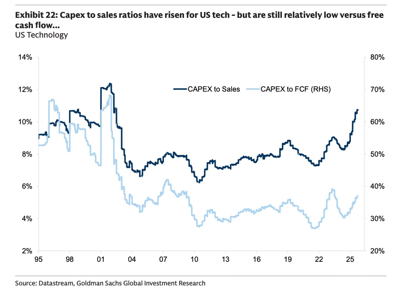 De schaal van Alphabet’s investeringscyclus is ongekend: vier jaar geleden lag de capex (de kapitaalinvesteringen) onder de 30 miljard dollar; dit jaar gaat Alphabet voor het eerst ruim boven de 90 miljard. Gezamenlijk investeert Big Tech inmiddels meer dan één biljoen dollar in AI-infrastructuur. De grafiek hieronder laat zien dat deze enorme investeringen van Big Tech beter in perspectief moeten worden geplaatst. Ja, de absolute bedragen zijn vandaag vele malen hoger dan tijdens de internetbubbel. Maar de onderliggende winst- en kasstroomgeneratie van deze bedrijven is óók veel sterker dan toen.