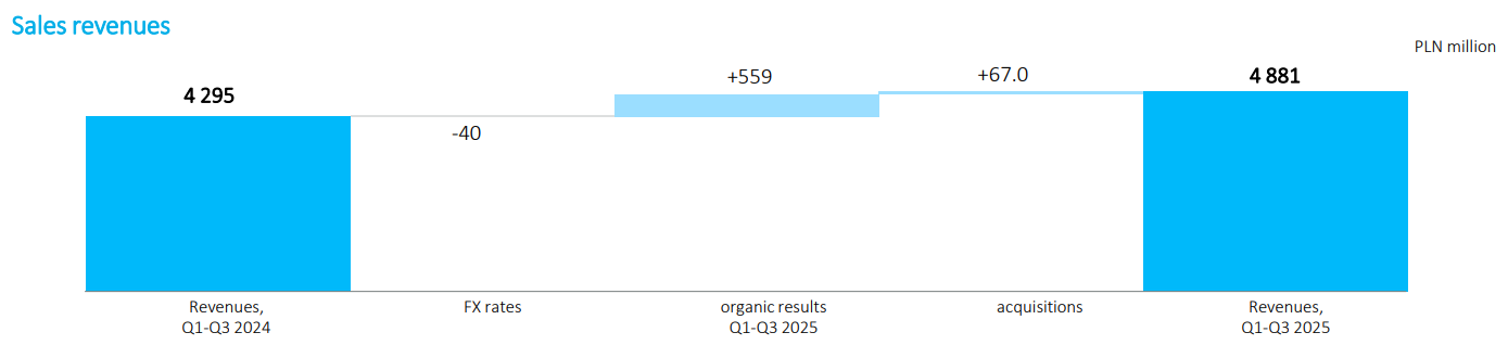Hoewel margeverbetering de kern van de investment case vormt, is het minstens zo belangrijk dat het bedrijf ook sterk blijft groeien in omzet. Na correctie voor non-controlling interests steeg de omzet met 13,6%. Asseco is een serial acquirer en heeft dit jaar al negen overnames voltooid, maar deze groei blijkt vrijwel volledig organisch te zijn.
