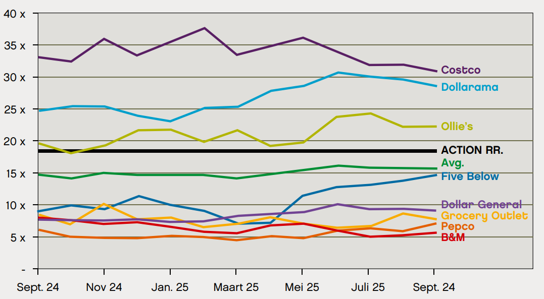In ons stuk wezen we erop dat 3i de waardering van Action opvallend voorzichtig houdt. Al jaren lang waardeert het management de keten met een multiple van 18,5x EBITDA, aan de onderkant van het spectrum wanneer je het vergelijkt met internationale sectorgenoten, wat neerkomt op €46,9 miljard. Retailers als Costco, Dollarama en Ollie’s noteren immers structureel op 22× tot boven 30× EBITDA.