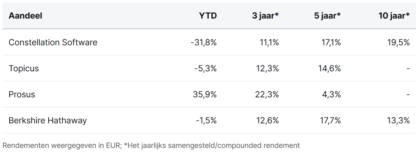 Constellation Software, Topicus, Prosus en Berkshire Hathaway worden momenteel aan de beurzen van Toronto, Amsterdam en New York verhandeld op koersen van respectievelijk CAD 3.314,66, CAD 125,01, EUR 52,12 en USD 504,25 (B-aandeel).