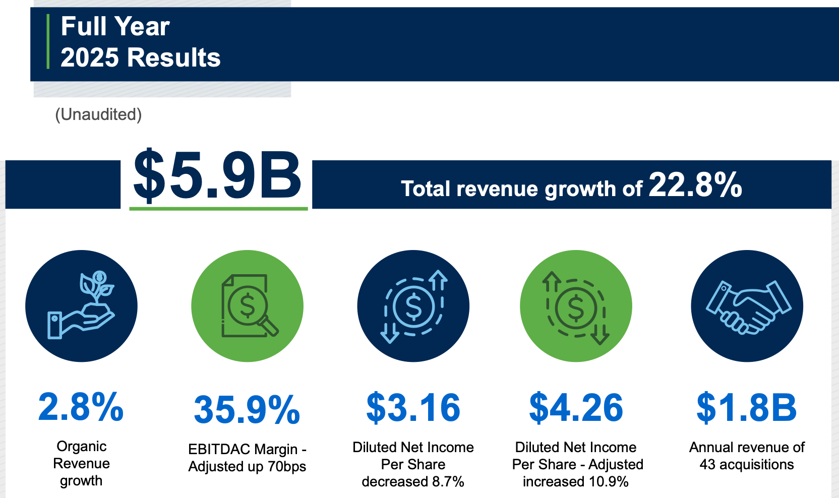 Op het eerste gezicht lijken de gerapporteerde resultaten robuust, met een totale omzetgroei van 22,8% en sterke marges. Echter, voor een onderneming die zo agressief groeit door acquisities, is de organische groei de enige zuivere graadmeter voor de werkelijke gezondheid van de portefeuille en de marktpositie. Op dit vlak schoot Brown & Brown het afgelopen jaar tekort. Met een organische groei van slechts 2,8% over het hele jaar, en zelfs een negatieve uitschieter in het laatste kwartaal, is er sprake van een duidelijke correctie ten opzichte van het vijfjaarsgemiddelde dat rond de 8-10% lag.