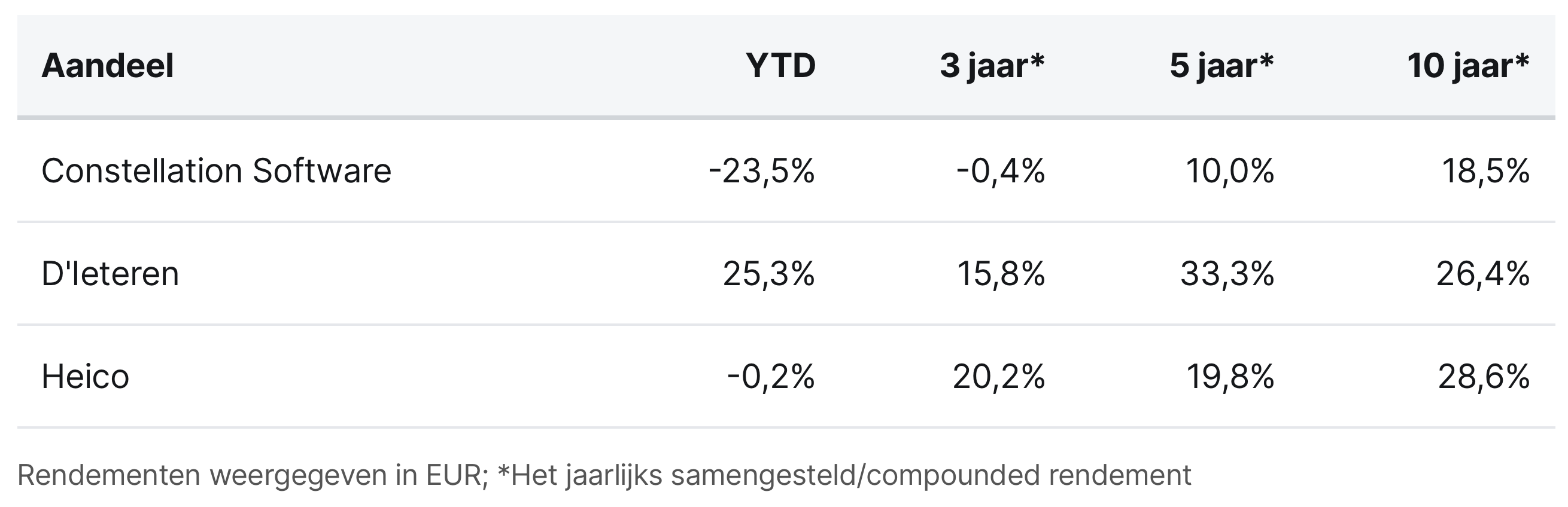 Constellation Software, D'Ieteren en Heico worden momenteel aan de beurzen van Toronto, Brussel en New York verhandeld op koersen van respectievelijk CAD 2.548,50, EUR 192,90 en USD 253,05 per aandeel.