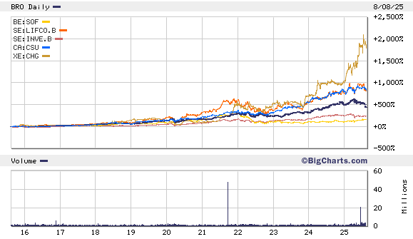 Brown & Brown, Chapters, Constellation Software, Investor AB, Lifco en Sofina worden momenteel verhandeld op koersen van USD 93,03, EUR 41,80, CAD 4.692,31, SEK 288, SEK 344,60 en EUR 276,20 per aandeel.