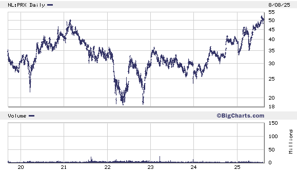 Prosus is de handelsweek aan de beurs van Amsterdam geëindigd op een koers van EUR 50,50 per aandeel.