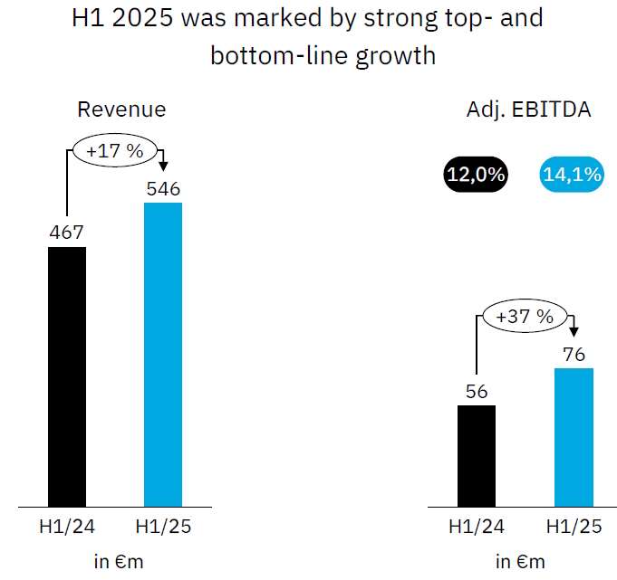 De operationele winst (EBITDA) maakte een sprong van maar liefst 36,8% naar EUR 76,4 miljoen. Dit resulteerde in een marge van 14,1%, een stijging van 2,1 procentpunt en een "historisch hoogtepunt voor een eerste halfjaar", aldus CFO Torben Teichler tijdens de toelichting op de cijfers.