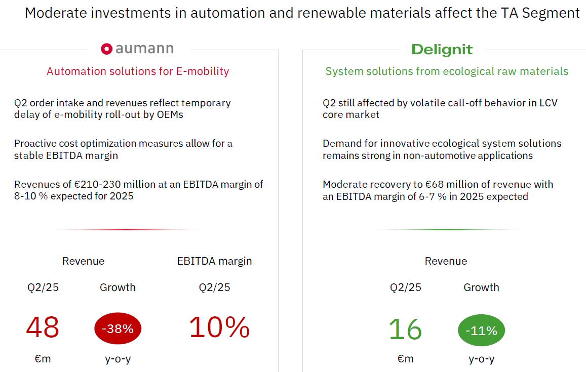 In schril contrast stonden de prestaties van het segment Technological Applications. De omzet daalde in het eerste halfjaar met 20,3% naar EUR 142 miljoen, voornamelijk door de terughoudendheid in de automobielindustrie.