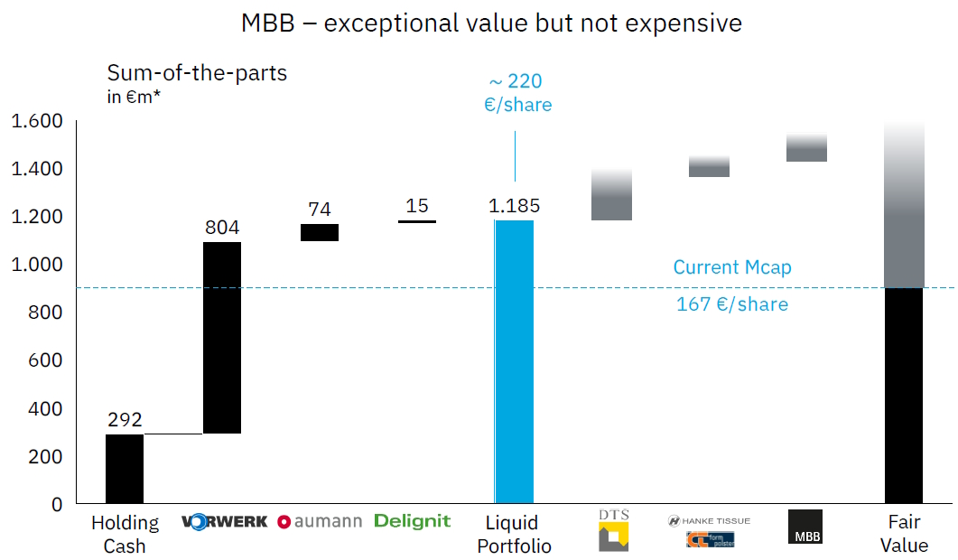 Bij Aumann participeerde MBB in een aandeleninkoopprogramma, waardoor het belang daalde naar 48,86%. Deze verkopen moeten dus niet gezien worden als een signaal dat MBB zich voorbereidt op een grote overname, maar als tactische zetten om de waarde van de dochters op de kapitaalmarkt te optimaliseren. Met een "oersterke" balans, met een netto kaspositie van EUR 457,4 miljoen op groepsniveau waarvan EUR 292 miljoen op holdingniveau, is MBB uitstekend gepositioneerd om overnamekansen te benutten.