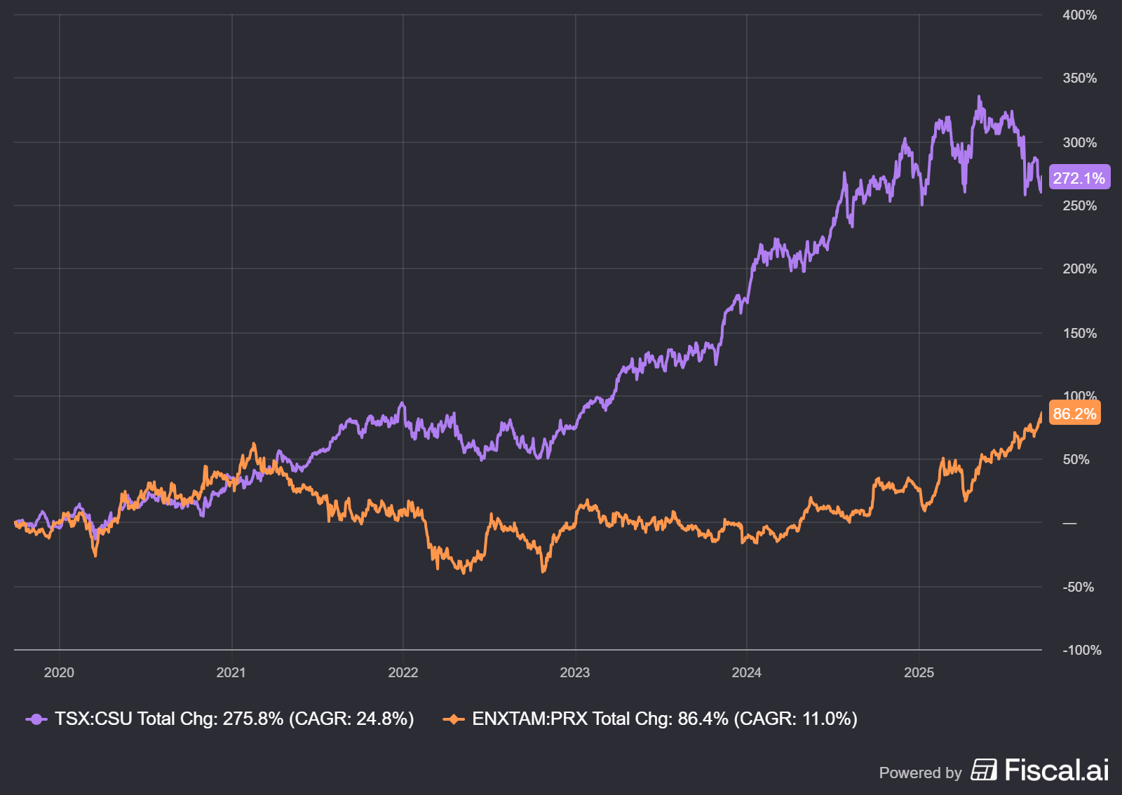 Constellation Software en Prosus worden momenteel verhandeld aan de beurzen van Toronto en Amsterdam tegen koersen van respectievelijk CAD 4.418,64 en EUR 56,93 per aandeel.