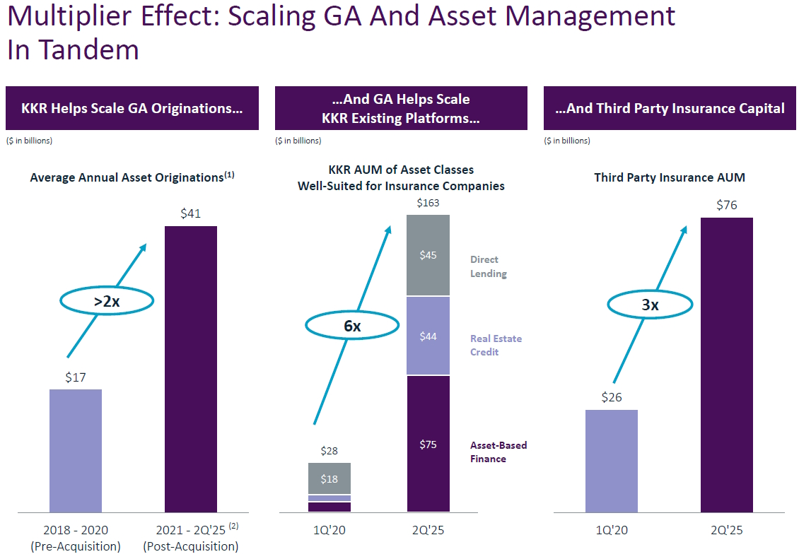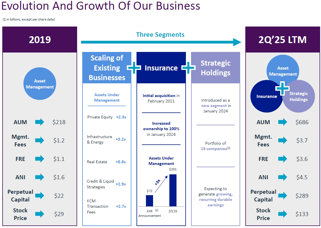 Dit model rust op de pijlers Asset Management, Insurance (via Global Atlantic) en Strategic Holdings. De historische kern is Asset Management, met bijna USD 700 miljard beheerd vermogen. Dit wordt aangevuld door de verzekeringstak Global Atlantic, die langlopende passiva aantrekt om via het KKR-platform te investeren. Ten slotte benut het segment Strategic Holdings de private-equity-expertise als een extra, kapitaalvriendelijke groeimotor.