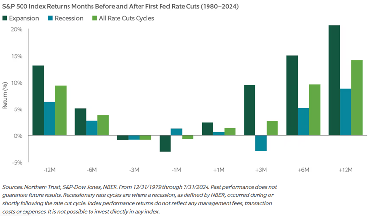 Asset manager Northern Trust onderzocht in “How stocks historically performed during Fed rate cut cycles” hoe de S&P 500 zich sinds 1980 gedraagt na renteverlagingen. De conclusie: aandelen stijgen gemiddeld 14% in de 12 maanden na de start van een verlagingstraject. Belangrijk is daarbij het onderscheid tussen scenario’s van groei en recessie: