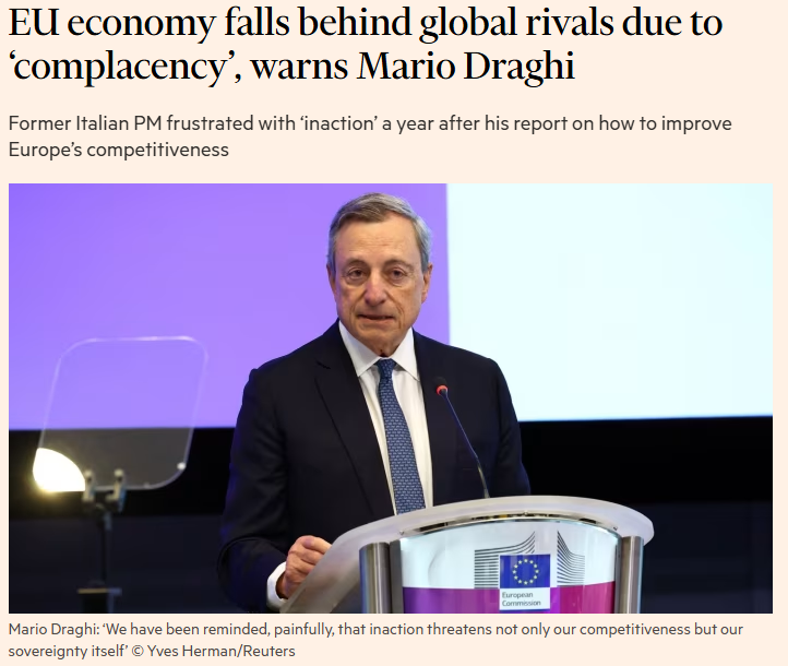 Volgens Draghi, voormalig ECB-voorzitter en door de Europese Commissie aangesteld om een hervormingsplan te schrijven, dreigt de EU blijvend achter te raken. Slechts een fractie van zijn eerder gepresenteerde 383 aanbevelingen is opgepakt. De grootste pijnpunten: hoge energieprijzen, trage regelgeving en onvoldoende investeringen. Met name op het gebied van digitale technologie en kunstmatige intelligentie loopt Europa ver achter op de VS en China, die miljarden investeren en toepassingen grootschalig implementeren. Dat zet druk op zowel de technologische soevereiniteit als het langetermijn groeipotentieel van de Unie.