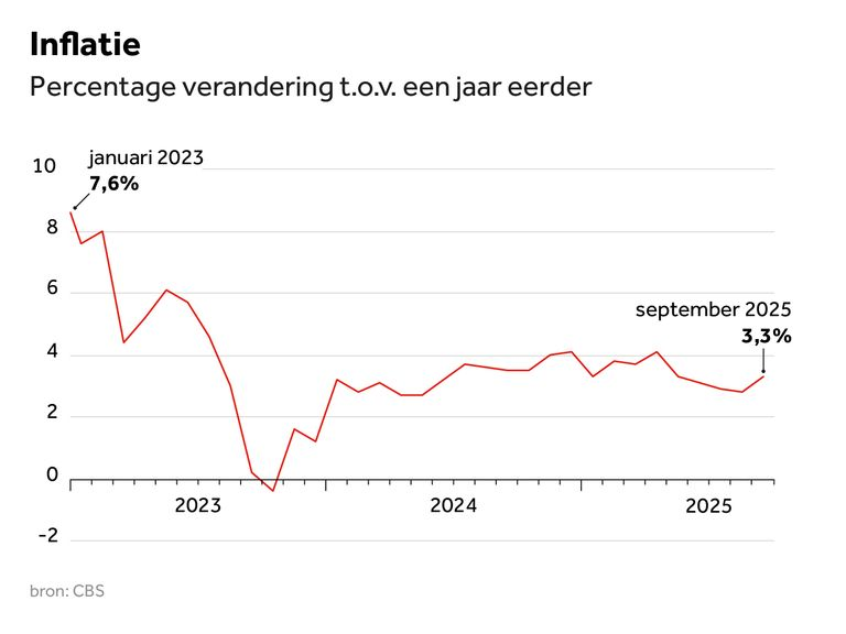 Nieuwe cijfers over de inflatie in Nederland (voor september) duiden dat deze weer oplopen met +3,3% yoy, na 2,8% yoy in augustus. De stijging van het Nederlands prijspeil werd vooral gedreven door hogere energieprijzen (+4,0%), diensten (+4,1%) en voeding (+3,7%). De geharmoniseerde Europese maatstaf (HICP) kwam uit op 3,0%. Opvallend is dat de olieprijs (-10%) en de euro/dollar-koers (-6%) beduidend lager liggen dan een jaar geleden, maar dat verstoringen (belastingen en vergroening) op de Nederlandse energiemarkt er toch toe leiden dat energie opnieuw een inflatiedrijver is.