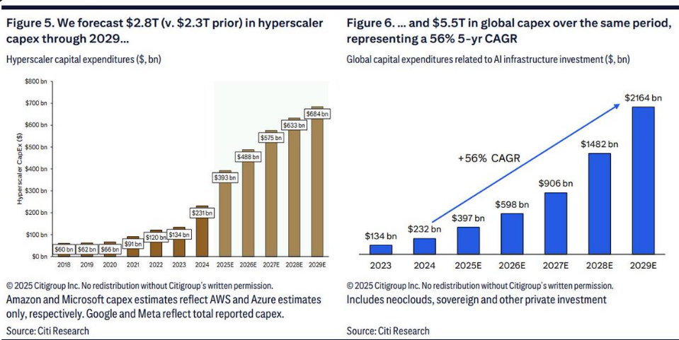 Voor 2026 wordt nu uitgegaan van een stijging van de wereldwijde CAPEX-uitgaven van $420 miljard naar $490 miljard. Dat komt neer op een verwachte +24% jaar-op-jaar groei, nadat de marktconsensus in Q2 al met +20% was verhoogd. Voor de periode 2023–2029 is de totale investeringsomvang inmiddels bijgesteld van $2.300 miljard naar $2.800 miljard. Citi verwacht bovendien dat grote technologiebedrijven bij de presentatie van hun Q3 2025-resultaten opnieuw verdere verhogingen van hun investeringsplannen zullen aankondigen.