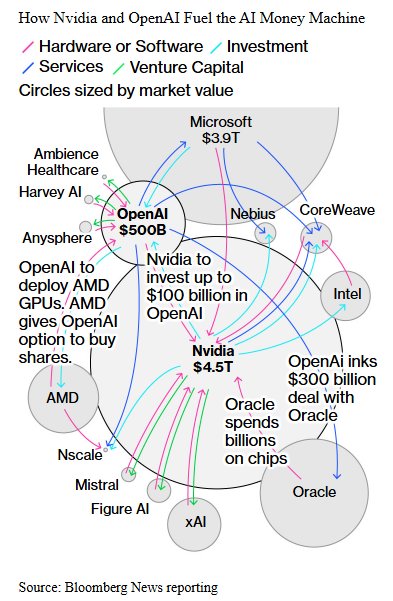 De onderlinge verwevenheid tussen de grote spelers in het AI-ecosysteem wordt steeds complexer. Niet alleen investeert Nvidia rechtstreeks tot $100 miljard in OpenAI, ook partijen als Microsoft, Oracle en AMD bouwen tegelijkertijd strategische posities in de waardeketen op, van chipproductie tot clouddiensten en AI-toepassingen. De onderstaande grafiek van Bloomberg visualiseert deze “AI-money machine”: hoe kapitaal, hardware, cloudcapaciteit en aandelenbelangen tussen de grootste spelers in hoog tempo in elkaar grijpen. Samen vormen zij de motor achter de huidige AI-hausse en illustreren zij hoe de grenzen tussen samenwerking en concurrentie steeds verder vervagen.