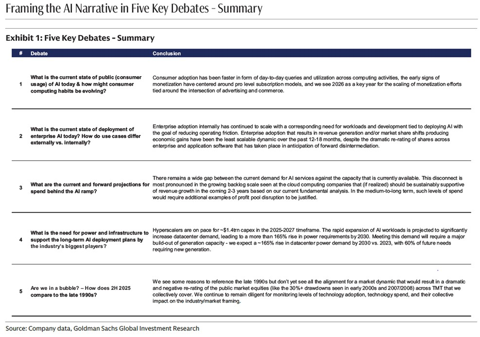 Tegelijkertijd groeit de twijfel of deze hausse nog fundamenteel onderbouwd is. Goldman Sachs probeert de discussie te kaderen met vijf sleuteldebatten over de huidige AI-euforie, van consumentenadoptie en bedrijfsintegratie tot de noodzaak van energie-infrastructuur.