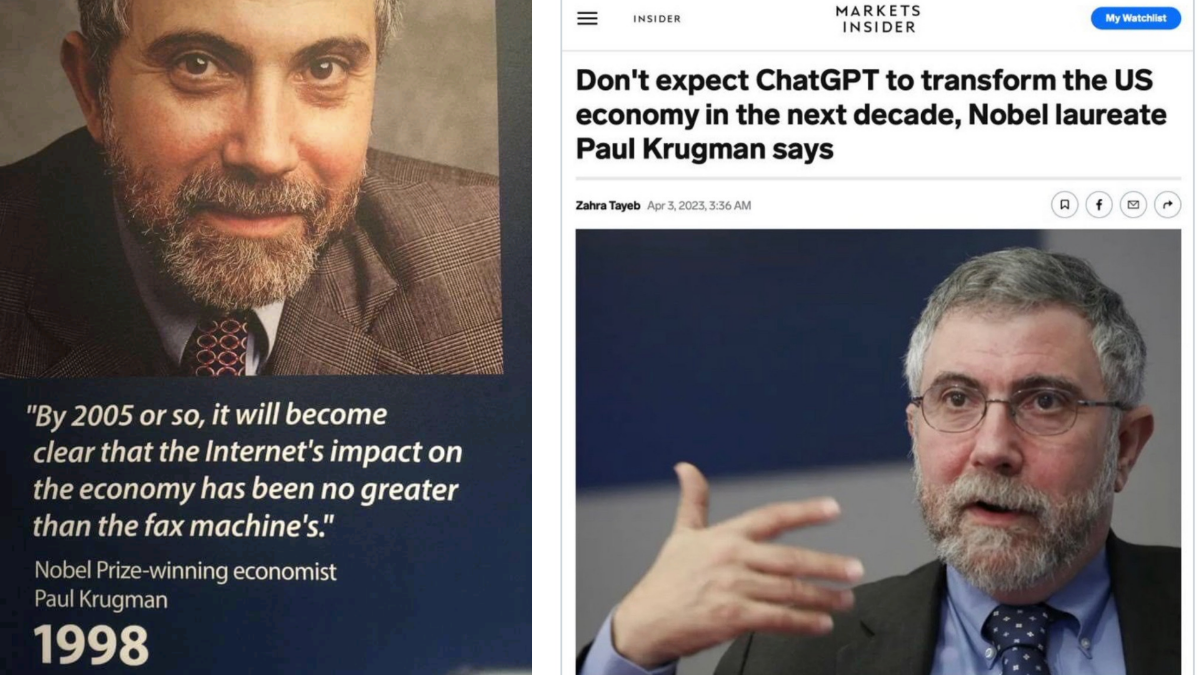 De vergelijking met de dotcomperiode dringt zich desalniettemin op. Destijds werd de impact van het internet massaal onderschat, zelfs door Nobelprijswinnaar Paul Krugman, die in 1998 stelde dat “het internet in 2005 niet meer invloed zal hebben dan de faxmachine.” Een kwarteeuw later herhaalt hij zijn scepsis, ditmaal over ChatGPT en kunstmatige intelligentie. De inmiddels virale collage van zijn uitspraken symboliseert hoe technologische revoluties vaak eerst worden weggewuifd, om vervolgens de economische realiteit fundamenteel te veranderen.